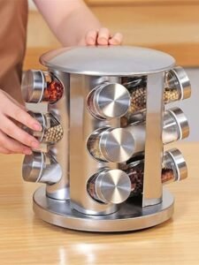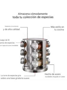 Condimentero Giratorio de Acero Inoxidable – 12 Frascos de Vidrio