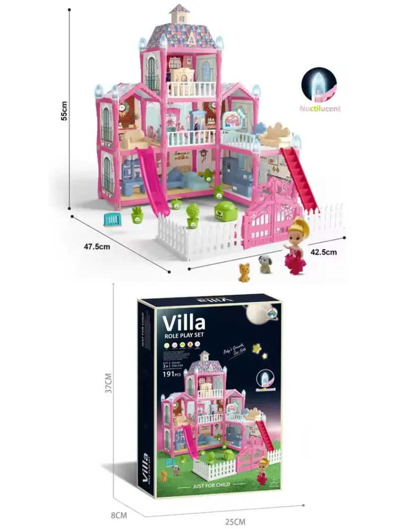Haz que la imaginación de tu pequeña brille con nuestra Casa de Muñecas Luminosa. Este set no es solo un juguete, es el escenario donde su «princesa interior» vivirá miles de aventuras. Con 191 piezas y 8 estancias decorables, tu hija podrá simular rutinas diarias divertidas: desde levantarse en su dormitorio y ver televisión, hasta pasear al perro en el jardín.